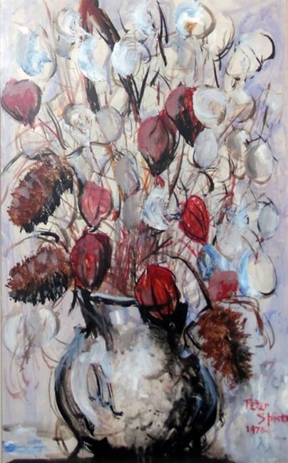 Fred Bollands Watercolour drawingAutumn woodland, signed lower right, 27cm x 37cm June Peel PastelFlowering magnolia branch, signed lower right, 29.5cm x 43cm Peter Spicer Gouache and bodycolourStill life flowers in a vase, signed and dated 1978, 46cm x 29cm (3)