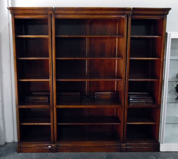 Mahogany library bookcase of three parts, comprising six shelves, on a plinth base, 222cm wide approx (plus extra parts to separate the sections)