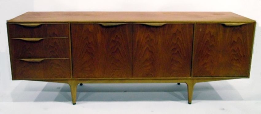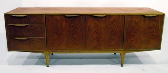 20th century teak sideboard with three short drawers and cupboards, raised on square tapering supports, by A H McIntosh & Co, Kirkcaldy, Scotland, length 202cm