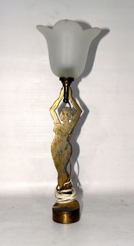 1920s brass-finish metal table lamp modelled as a two-dimensional nude female supporting a glass flower shaped shade, 40.5cm high