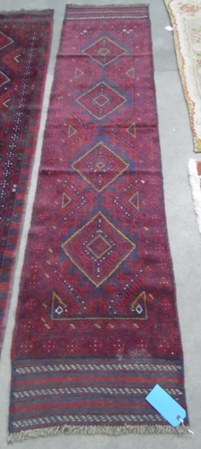 Meshwani runner having four lozenge medallions to the red ground and having geometric borders, 255cm x 60cm