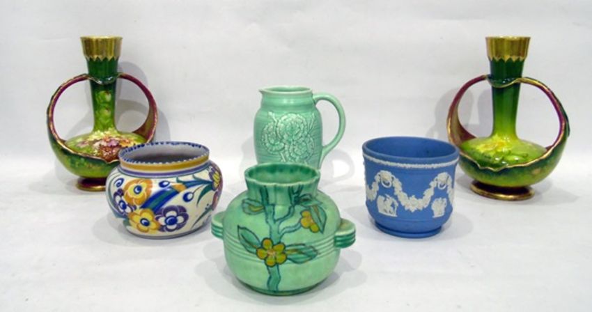 Poole pottery bowl decorated with flowers, an Art Deco two-handled vase decorated with flowers on a green ground, a Wedgwood blue jasperware jardiniere, a pair of late 19th/early 20th century two-handled vases painted with flowers and a jug (6)