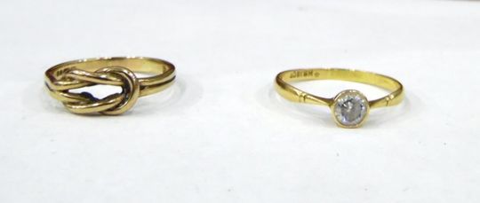 18ct gold solitaire ring set with single white stone (not testing as diamond) and a 9ct gold knot pattern ring, ring size 'R' approx (2)