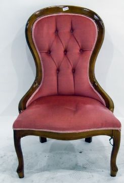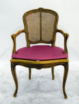 Reproduction Victorian style button back mahogany chair in pink ribbed stuffover fabric, a French style polished wood bergere open armchair with cane back and seat and a pair of cane garden armchairs (4)