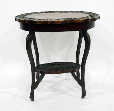 Victorian carved mahogany occasional table, oval with serpentine sides, floral and foliate carved border, under-shelf below, on carved cabriole supports
