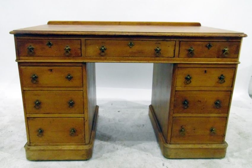 Victorian pine kneehole desk, the top with thumb-mould edge and having an arrangement of nine short drawers around the kneehole, brass Gothic-pattern drop ring handles and escutcheons, on plinth base, 122cm wide