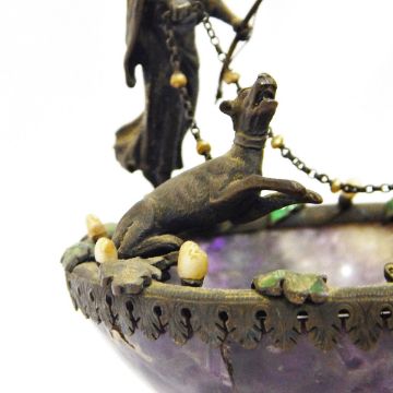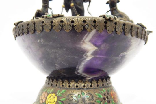 Late 19th century Historismus enamelled silver-mounted hardstone bowl, probably Austro-Hungarian (indistinct mark) the circular blue john bowl surmounted by a standing figure of Diana with her chained hounds, the rim with enamelled leaves and freshwater pearls, on a circular pedestal base with enamelled floral decoration, 14cm high (areas of loss, tarnished and dirty)