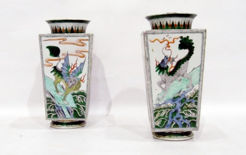 Pair of Chinese square tapering vases, cream ground, each side depicting various dragons on shells above the sea, in green and red, 27cm high
