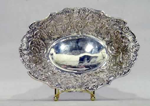 19th century silver oval dish with repousse decoration (marks rubbed), 5oz approx
