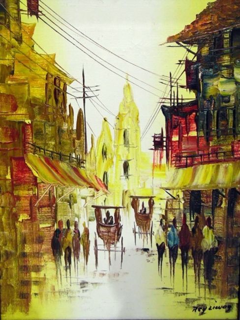 E Capans(?) (20th century school) Oil on canvasOriental river landscape, signed lower right, 44cm x 59cm Reg Liwog(?) (20th century school) Oil on canvasOriental street scene, signed indistinctly lower right, 39cm x 29cm (2)