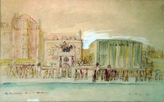 P Tucker Watercolour drawing "The Pheasantry, Kings Road, Chelsea", busy London street scene, signed bottom right and dated 1970, 17cm x 29cm