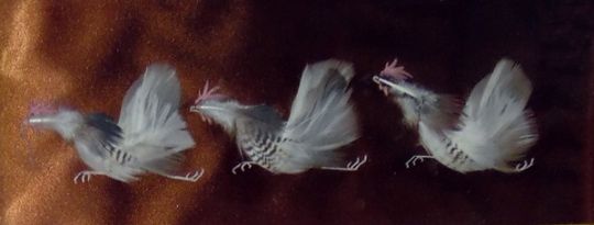 Pair of Chinese watercolour drawings depicting birds, insects and flowers, 40cm x 30cm and three pictures made from duck and chicken feathers depicting ducks and chickens (5) PLEASE NOTE CHINESE NOT JAPANESE