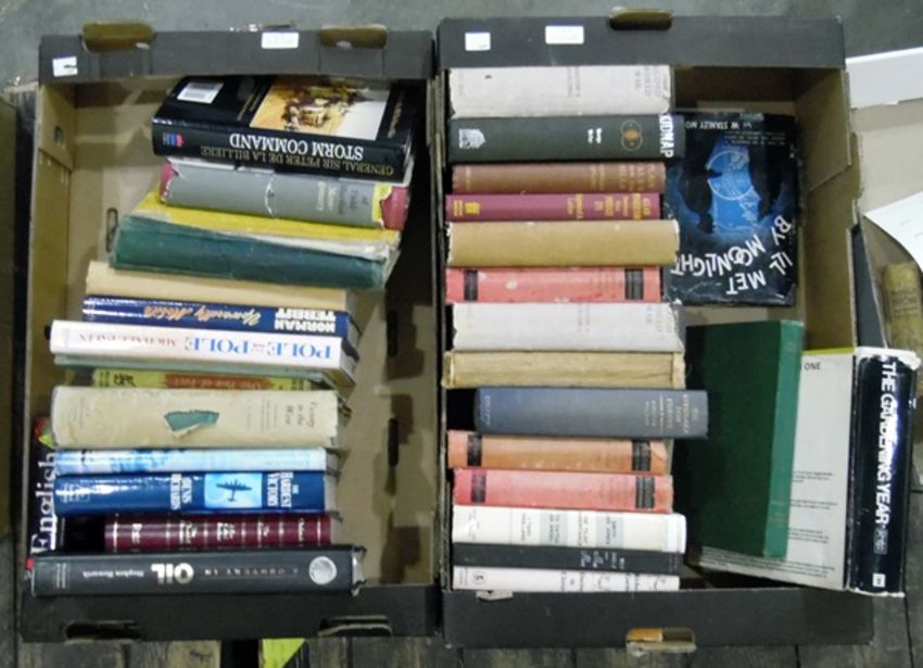 Quantity of hardback books including:-Palin, Michael"Pole to Pole"Stanley Moss, W "Ill Met by Moonlight" with unclipped dj, etc (2 boxes)