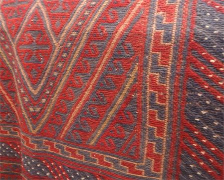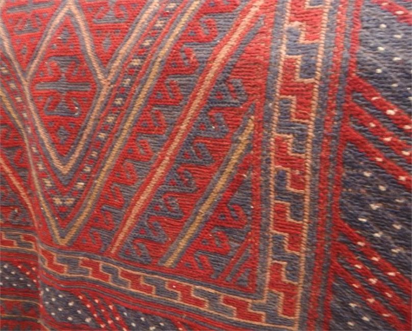 Kazak wool rug with central lozenge, having multiple hooked borders all in blue and red, formal borders and guard stripes, 116cm x 115cm