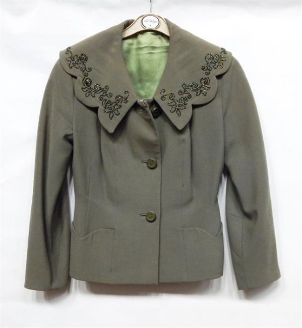 Jenners of Edinburgh dark blue button fronted dress with side pockets, white ribbed cotton detail which are removable and a white detail removable collar, with belt and a 1950's green jacket with bugle bead embroidery to the deep collar, three button front (2)