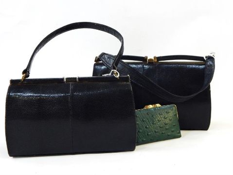 Two black vintage snakeskin fixed-frame handbags and a green leather ostrich purse (3)