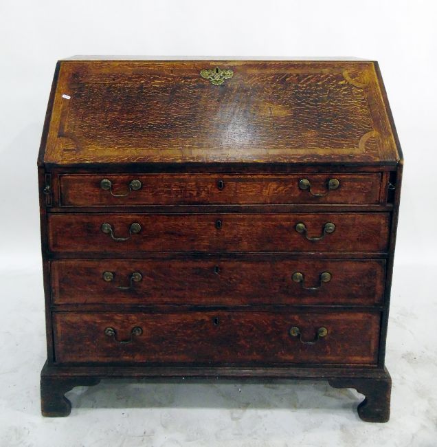 Late 18th/early 19th century oak bureau, the fall and drawer fronts with mahogany banding, the drawers with brass bale handles, on bracket feet, 106cm wide