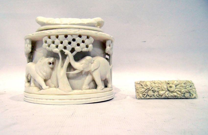 Early 20th century ivory lidded box with carved relief of animals, including elephant, lion, camel and gazelle, 10cm high and a Victorian carved ivory needle case, rectangular, with floral relief, 7cm x 2.5cm (2)