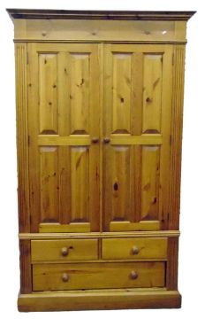 Modern pine wardrobe enclosed by two field panelled doors, over two short and one long drawer, on plinth base, 119cm wide