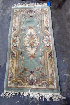 Chinese washed wool rug, pale green ground with oval medallion, allover floral and scroll decorated, in pastel shades, 165cm x 77cm approx and another circular wool rug, floral decorated to cream ground (2)