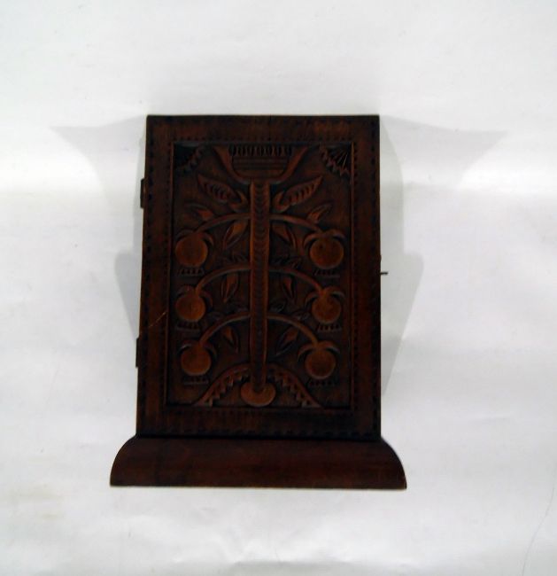 Arts and Crafts stained wood or fruit wood small cabinet, the hinged door carved with a fruit tree, 29cms high.