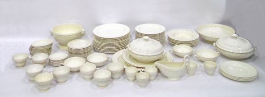 Quantity of late Victorian Wedgwood embossed Queensware dinner service comprising graduated plates, pedestal soup tureen, coffee cups, teacups, soup bowls, etc