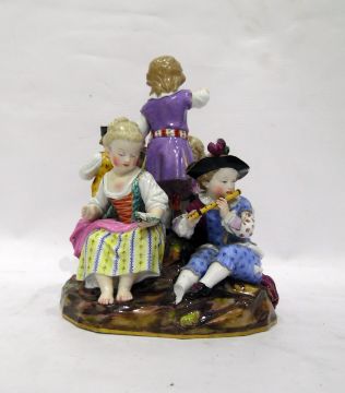 Early 19th century Meissen porcelain figure group of children playing musical instruments, the central boy conducting the score, all supported on painted rocky outcrop, underglaze blue cross swords to base (damaged - firing cracks to base, lost foot to flutist, chip to hat, broken score to adjacent young girl and fingers, two hands missing from clapping boy, girl playing lyre hand and end of lyre broken off, also loss to her foot, conductor lost his baton), 26cm high