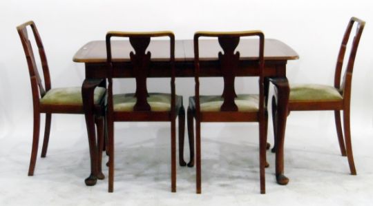 Walnut veneered extending dining table on straight cabriole shaped legs with pad feet and a set of four dining chairs with vase-shaped splats (5)