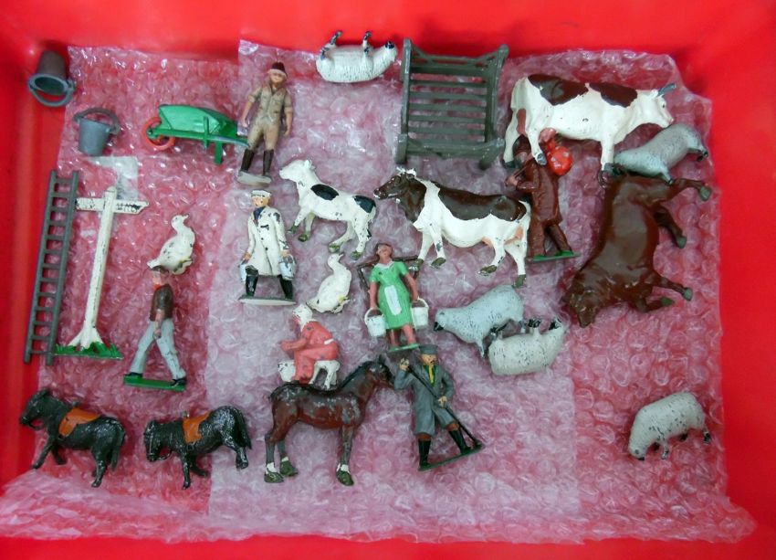 Quantity of lead farm animals and related figures including milkman, signpost, wheelbarrow, etc