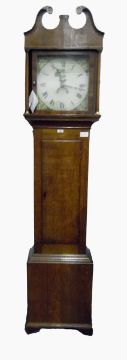 19th Century oak and mahogany longcase clock with swan-neck pediment, floral painted dial, calendar aperture, the hood with pair brass capped columns on bracket feet, 200cms high approx