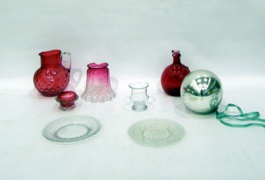 19th century cranberry glass jug of dimpled form, a cranberry decanter, a further salt, lampshade, etc, a mercury glass ball, pair of glass plates and another vase (8)
