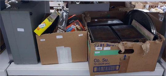 1950's / 60's retro wall clock, assorted framed pressed flowers, EPNS tray, assorted toys made by Crescent of the Wild West and another (3 boxes)