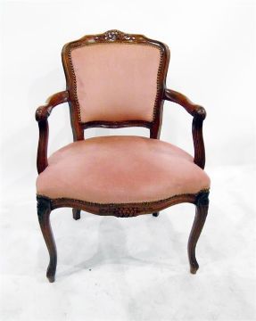 French style giltwood framed wingside chair with floral carved crest and padded arms, on fluted supports and a mahogany framed open arm elbow chair with upholstered back and seat (2)