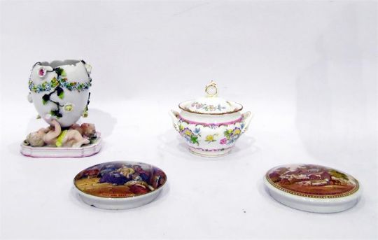 Quantity of 19th century decorative porcelain to include egg-shaped vase supported by putti, floral encrusted decoration, 13cm high, Mintons lidded pot and two pot lids, 'Hide and Seek' and 'Anne Hathaway's Cottage' (4) (vase chipped encrusted decoration, worn gilt to edge, Hide and Seek pot lid has several chips to the inside and discoloured rim)