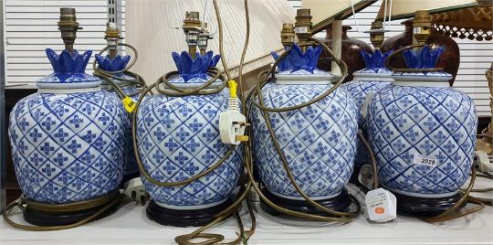 Eight matching ceramic blue and white circular table lamps on wooden stands (8) (VAT payable on hammer)