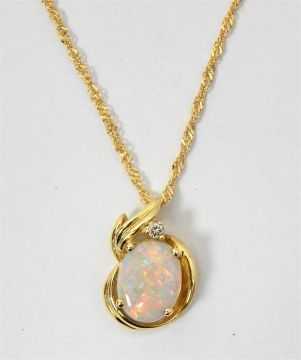 18ct gold, opal cabochon and diamond pendant on 18ct gold chain, 3g in total