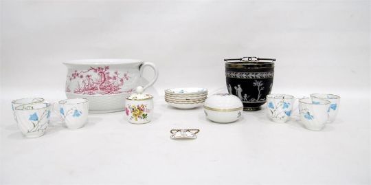 Quantity of ceramics to include a Wedgwood black jasperware ice pail, Victorian porcelain coffee service retailed by T Goode & Co, pottery commode of aesthetic design, etc