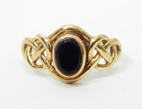 9ct gold cameo ring, a 9ct gold and onyx set ring, a 9ct gold heart-design wishbone ring and a 9ct gold and peridot ring (4)