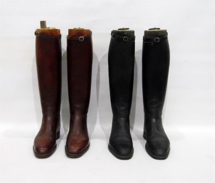 Two pairs of leather hunting boots, one pair brown and one pair black, each with Maxwell wooden trees, with brass hoop handles, size 10 approx