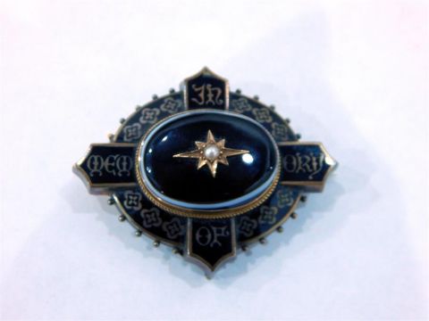 Victorian black enamel silver and gold coloured metal mourning brooch, oval, with oval onyx set to the centre, inseet with seedpearl gothic border inscribed 'In Memory of ' with locket to reverse