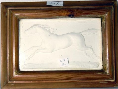 Plaster plaque, showing galloping horse, 11 x 7.5 cms approx, framed