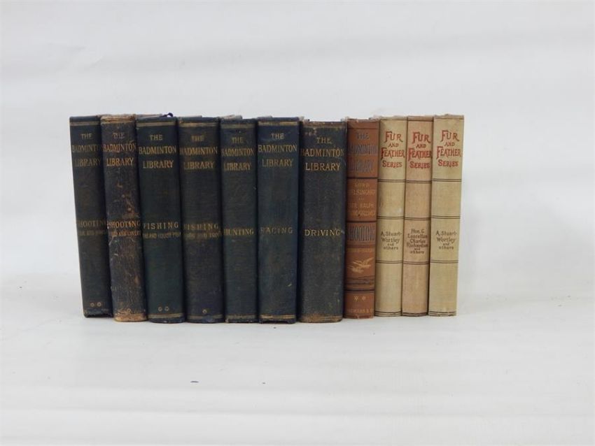 Various vols of The Badminton Library including Driving, Hunting, Racing, Fishing Pike and Course Fishing Salmon and Trout, Shooting Moor and Marsh, Shooting Field and Cover, all half leather with orange bds, all a little bumped and rubbed, Badminton Shooting Moor and Marsh in original pictorial cloth and three vols of Fur and Feather, the Partridge, the Hare and the Grouse (1 box)
