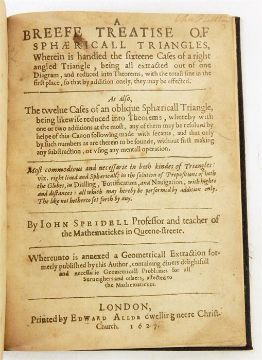 Speidell, John (professor and teacher of the mathematickes in Queene-Streete) "A Breefe Treatise of Sphaericall Triangles ...", printed by Edward Allda, London 1627, mathematical diagrams, some staining, has been rebound in full black leather, no titles