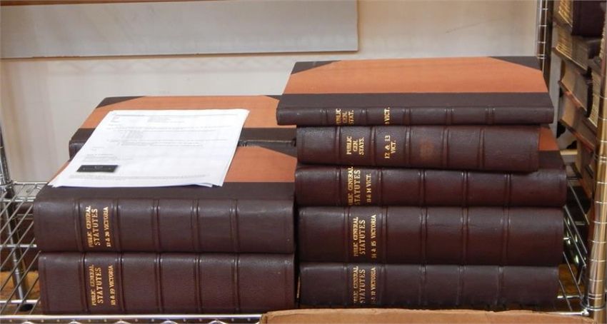 Large quantity of General Statutes, Queen Victoria, Public Statutes, George III, some full leather, some vols half leather with orange bds, gilt titles and raised bands (bought as seen)