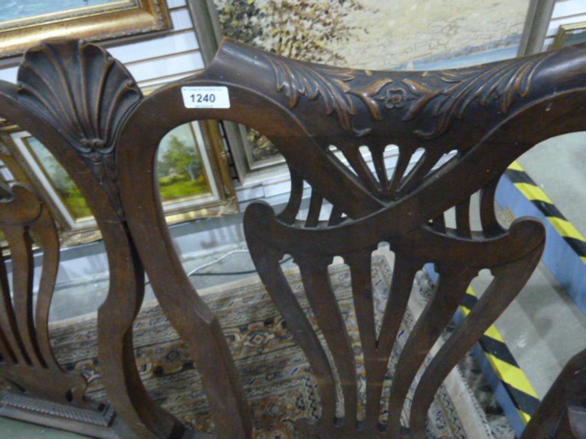 19th century mahogany double chair back open arm settee with pierced and carved vase-shaped splats, shaped crest rail with shell centrepiece, carved cabriole legs with claw and ball feet (possibly Irish)