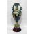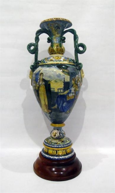 Large majolica two-handled urn with mask and serpent-shaped handles, the body decorated with pastoral scene of figures with cattle by river and interior scene of maiden and warriors, on a circular plinth base decorated with putti, 74cm high