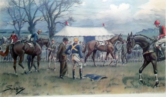 After Snaffles Colour print "Oh! To Be In Ireland Now That April's There", racehorses in collecting ring, titled on mount, bearing vignette, signed in pencil