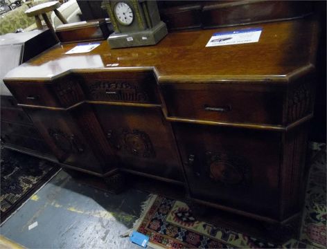 Oak sideboard with carved back of fruit, three drawers above three cupboards, on carved base, 164cm wide Please see lots 1092 and 1274 matching suite