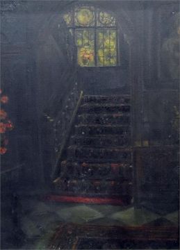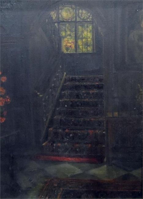 19th century English school Oil on canvas  Interior scene depicting main staircase from the hall, unsigned, 37cm x 27cm