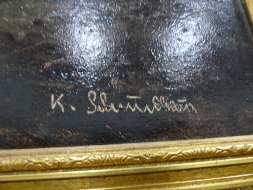 Oil on canvas Continental lake scene, mountains in the background, barn and figure on the right, rowing boat setting off from the water's edge, indistinctly signed 'K Sil...'(?) lower right, 59.5cm x 90cm